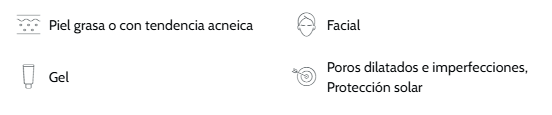 Su fórmula no comedogénica y ligera en textura gel libre de aceites deja la piel suave, lisa y sin brillos tras su aplicación. Su complejo con doble acción matificante-seborreguladora hace que sea adecuado para las pieles mixtas y grasas, con un acabado mate y seco al momento.