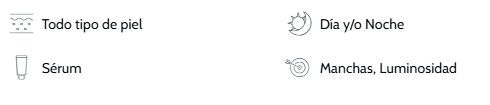 Sérum iluminador y unificador para un tono de piel radiante y uniforme. Ideal para pieles sensibles y aquellas que no toleran el retinol y/o AHA'. Su uso es apto incluso durante el verano, día y noche.